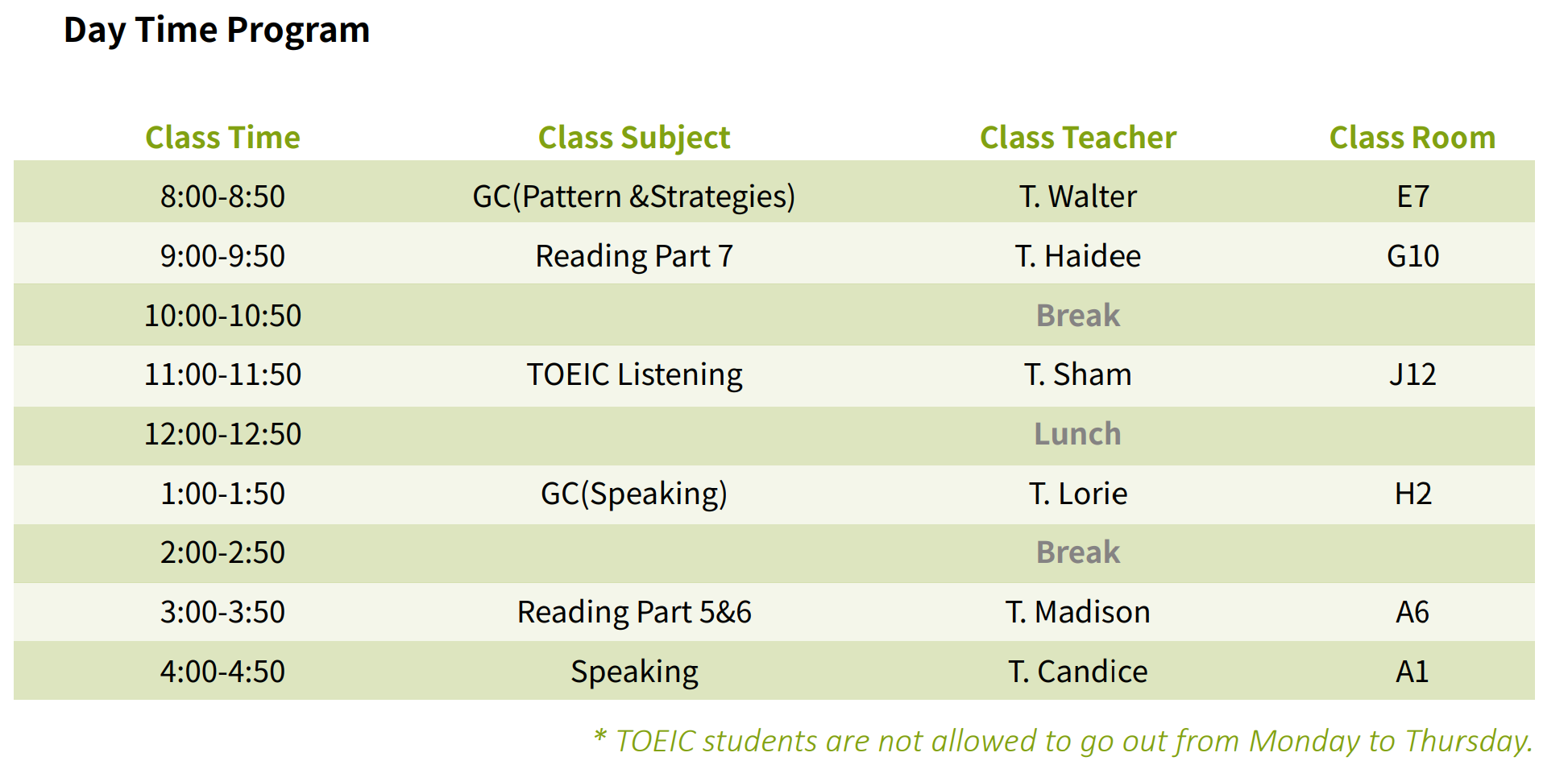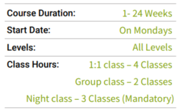 1:1 Lesson – 4 classesGroup Class – 2 classesEvening Mandatory Self-study – 3 classes